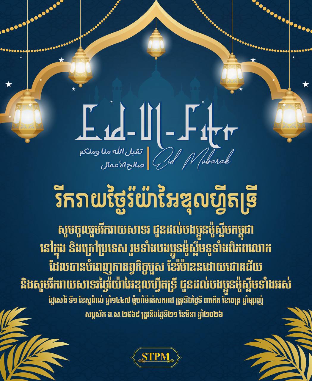 សម្តេចធិបតី ហ៊ុន ម៉ាណែត៖ ក្នុងនាមរាជរដ្ឋាភិបាល នៃព្រះរាជាណាចក្រកម្ពុជា ខ្ញុំ និងភរិយា សូមអបអរសាទរ និងសូមជូនពរជ័យ សិរីសួស្ដី សុភមង្គល បវរមហាប្រសើរ ជូនដល់បងប្អូនមូស្លីមកម្ពុជា ទាំងក្នុង និងក្រៅប្រទេស រួមទាំងបងប្អូនមូស្លីមនៅទូទាំងសកលលោកផងដែរ ដែលបានបញ្ចប់នូវពិធីអំណត់បួសខែរ៉ម៉ាឌន ដែលជាសសរស្តម្ភទី៤ នៃសាសនាឥស្លាម ប្រកបដោយជោគជ័យ ហើយនឹងរីករាយស្វាគមន៍ថ្ងៃបុណ្យរ៉យ៉ាអៃឌុលហ្វីតទ្រី នៅថ្ងៃសៅរ៍ ទី១ ខែស្ហាវ៉ាល់ ឆ្នាំ ១៤៤៧ មូហាំម៉ាត់សករាជ ត្រូវនឹងថ្ងៃទី ៣កើត ខែចេត្រ ឆ្នាំម្សាញ់ សប្តស័ក ព.ស.២៥៦៩ ត្រូវនឹងថ្ងៃទី២១ ខែមីនា ឆ្នាំ២០២៦។