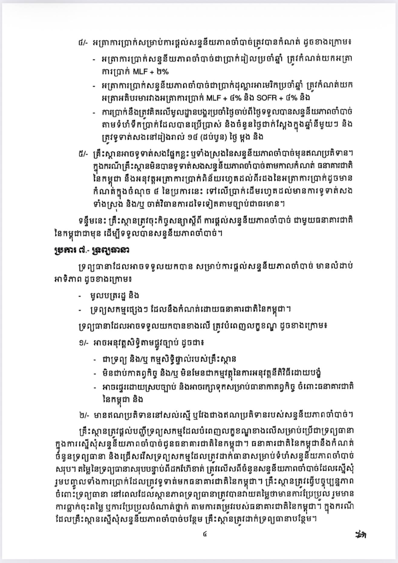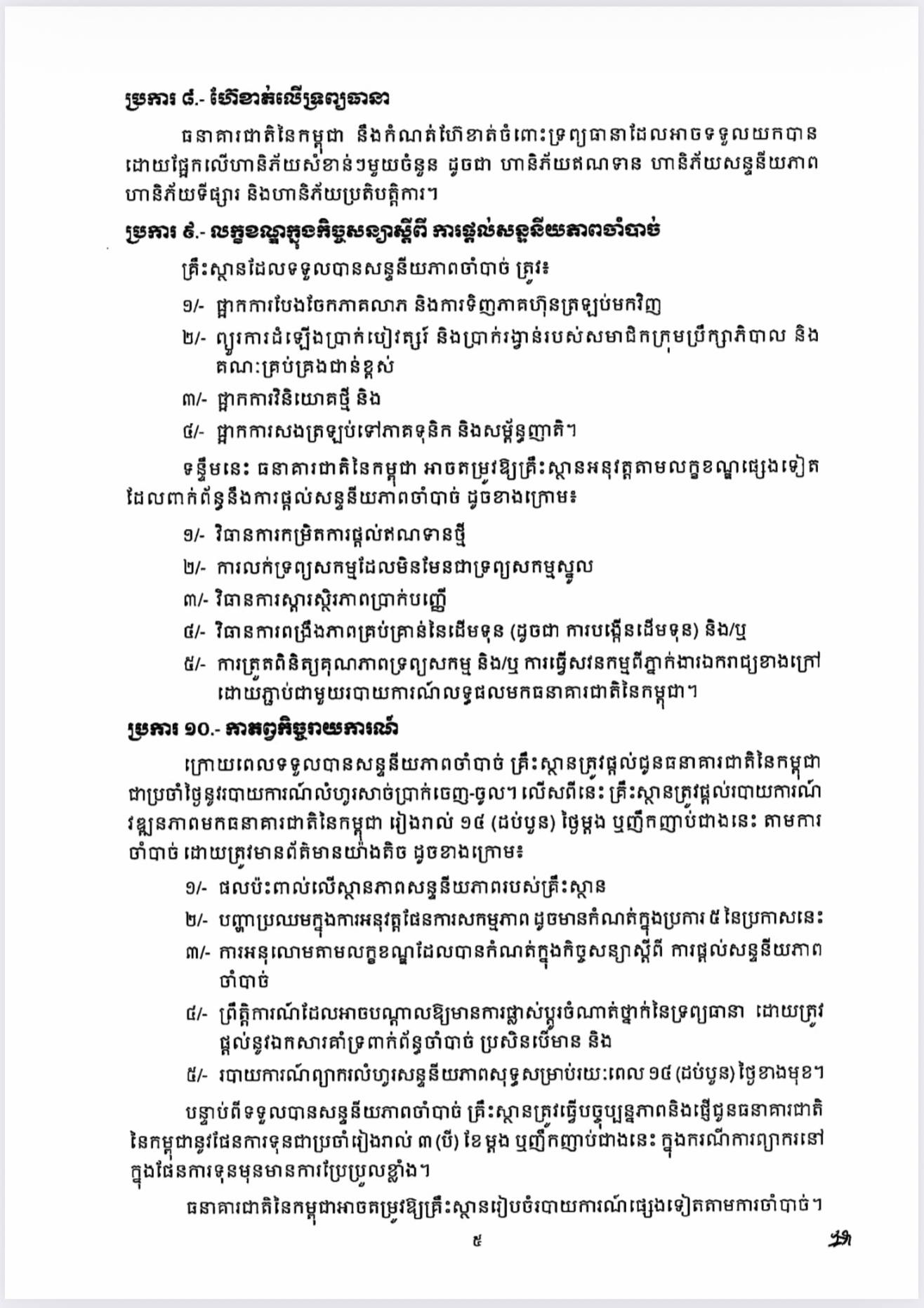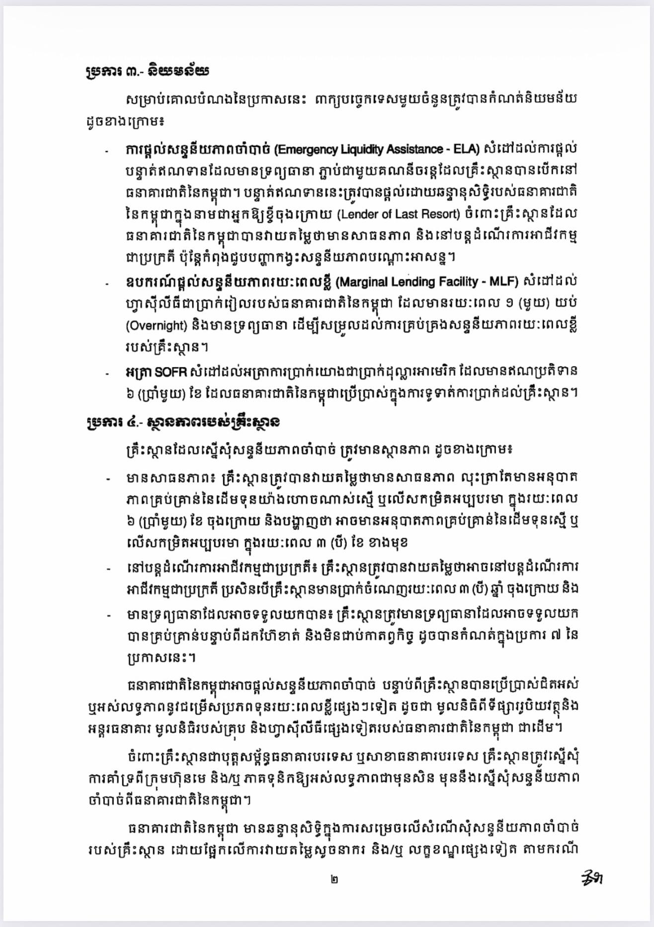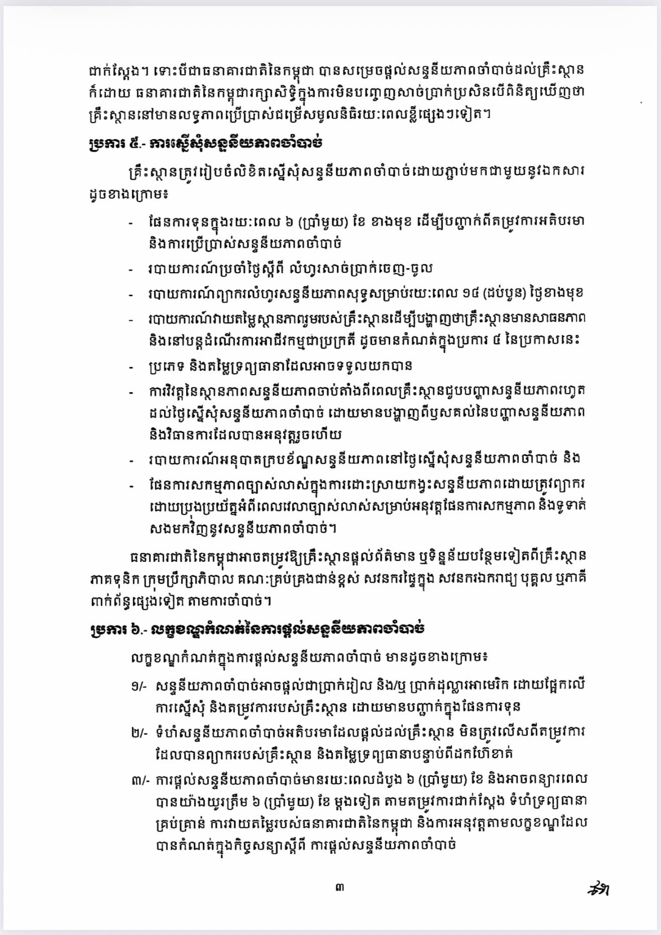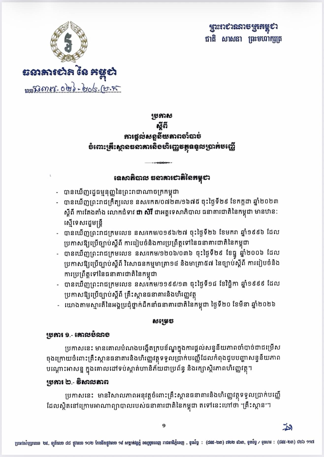 ធនាគារជាតិ នៃកម្ពុជា | ប្រកាស ស្តីពីការផ្តល់សន្ទនីយភាពចាំបាច់ ចំពោះគ្រឹះស្ថានធនាគារ និងហិរញ្ញវត្ថុទទួលប្រាក់បញ្ញើ