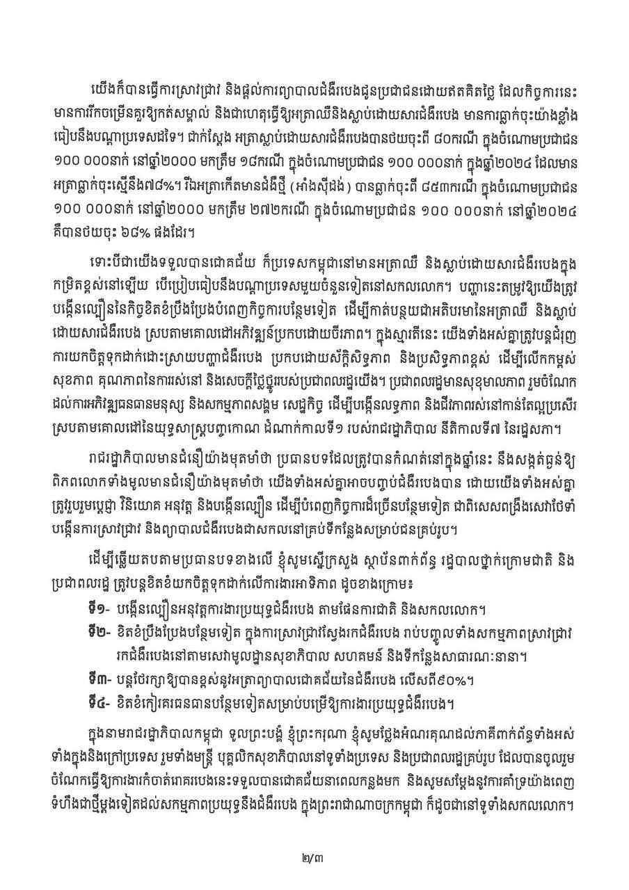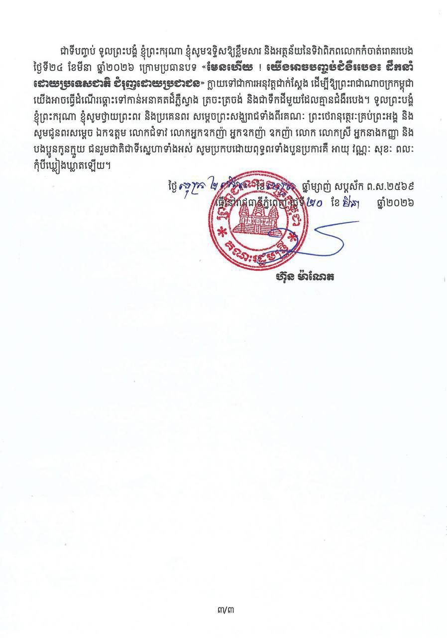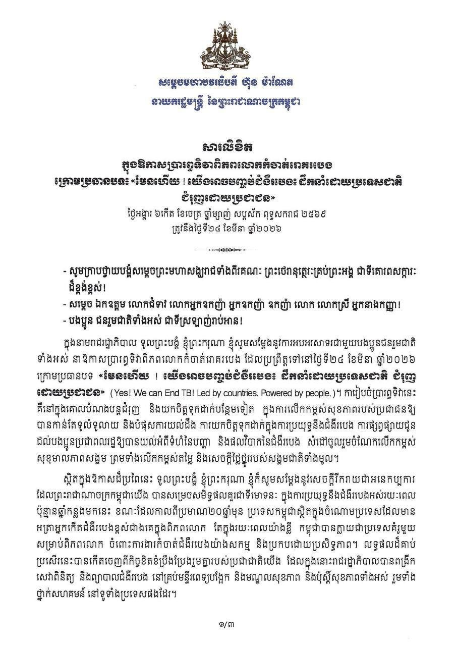 សម្តេចមហាបវរធិបតី ហ៊ុន ម៉ាណែត នាយករដ្ឋមន្ត្រីនៃកម្ពុជា ចេញសារលិខិតក្នុងឱកាសប្រារព្ធទិវាពិភពលោកកំចាត់រោគរបេង ក្រោមប្រធានបទ៖ «មែនហើយ ! យើងអាចបញ្ចប់ជំងឺរបេង៖ ដឹកនាំដោយប្រទេសជាតិ ជំរុញដោយប្រជាជន»
