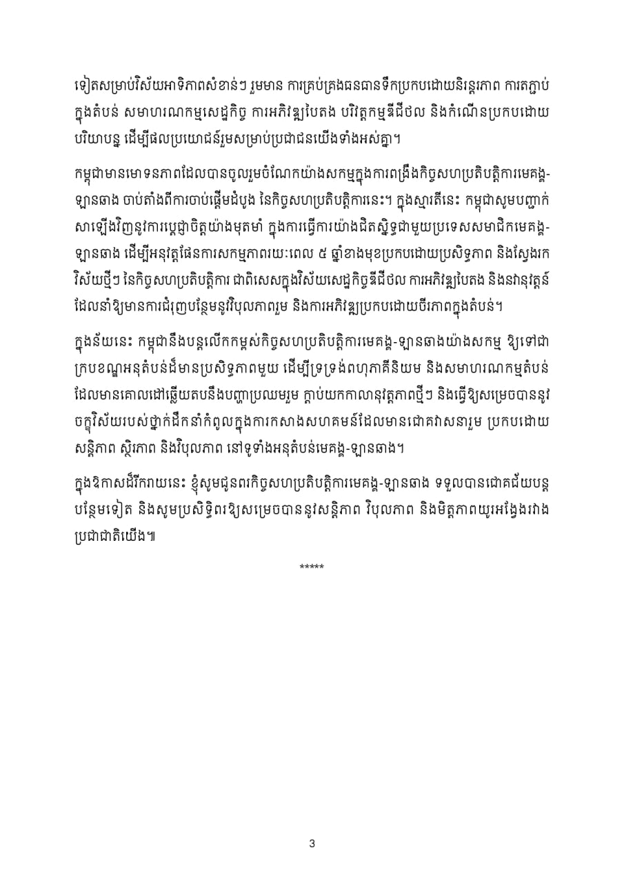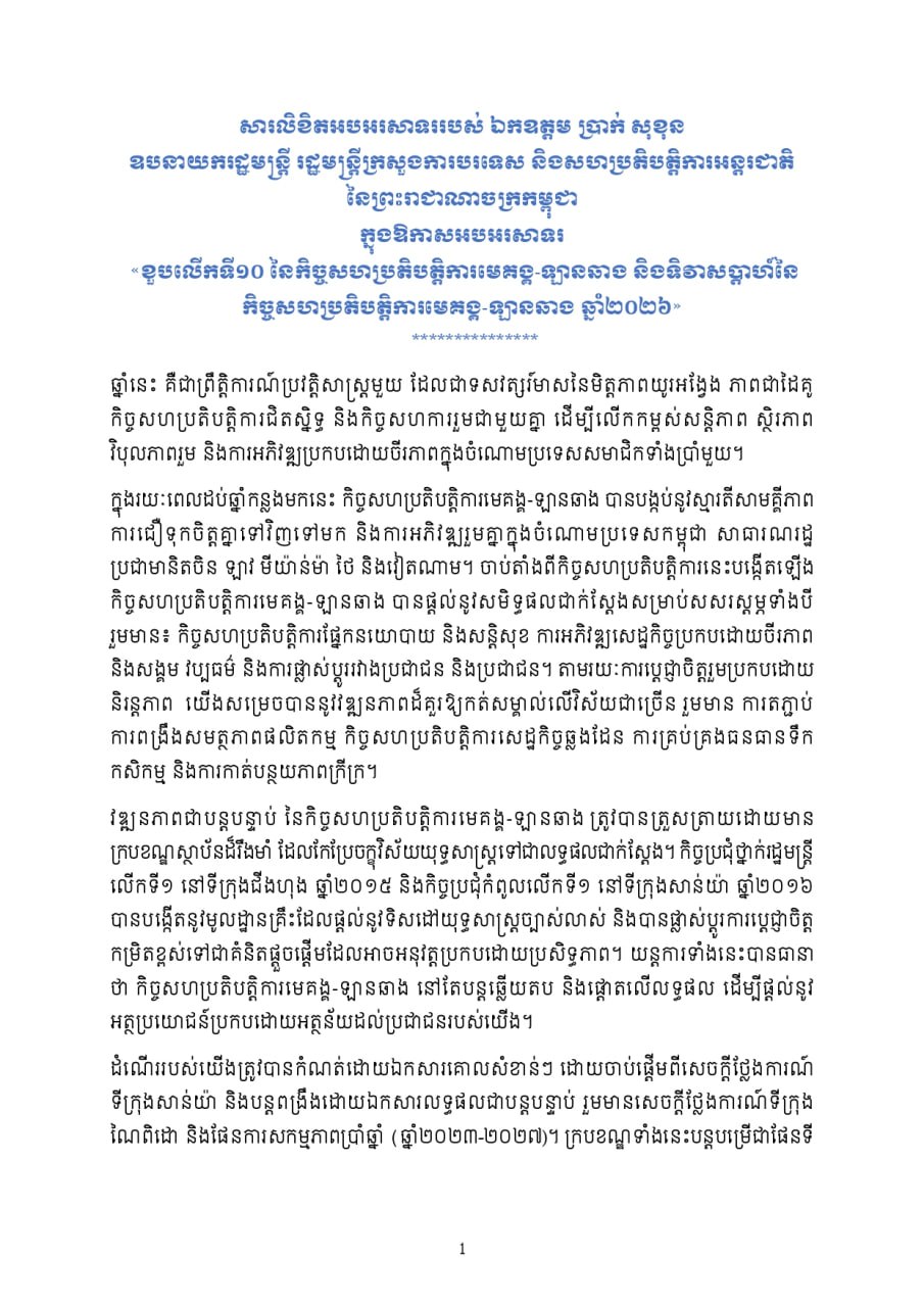 សារលិខិតអបអរសាទររបស់ ឯកឧត្តម ប្រាក់ សុខុន ឧបនាយករដ្ឋមន្រ្តី រដ្ឋមន្រ្តីក្រសួងការបរទេស និងសហប្រតិបត្តិការអន្តរជាតិ នៃព្រះរាជាណាចក្រកម្ពុជា ក្នុងឱកាសអបអរសាទរ «ខួបលើកទី១០ នៃកិច្ចសហប្រតិបត្តិការមេគង្គ-ឡានឆាង និងទិវាសប្តាហ៍នៃកិច្ចសហប្រតិបត្តិការមេគង្គ-ឡានឆាង ឆ្នាំ២០២៦»