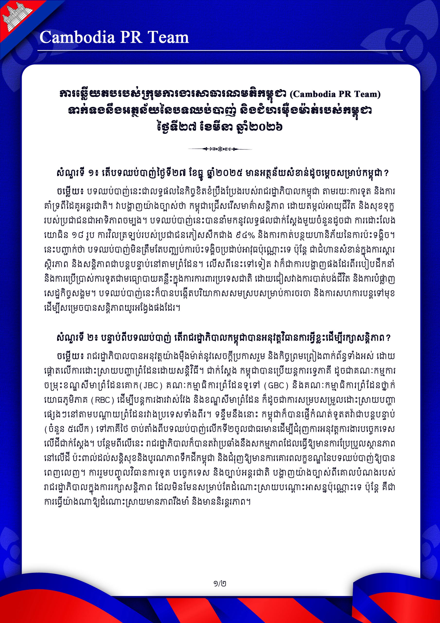 ទាក់ទងនឹងអត្ថន័យនៃបទឈប់បាញ់ និងជំហរម៉ឺងម៉ាត់របស់កម្ពុជា ថ្ងៃទី២៧ ខែមីនា ឆ្នាំ២០២៦