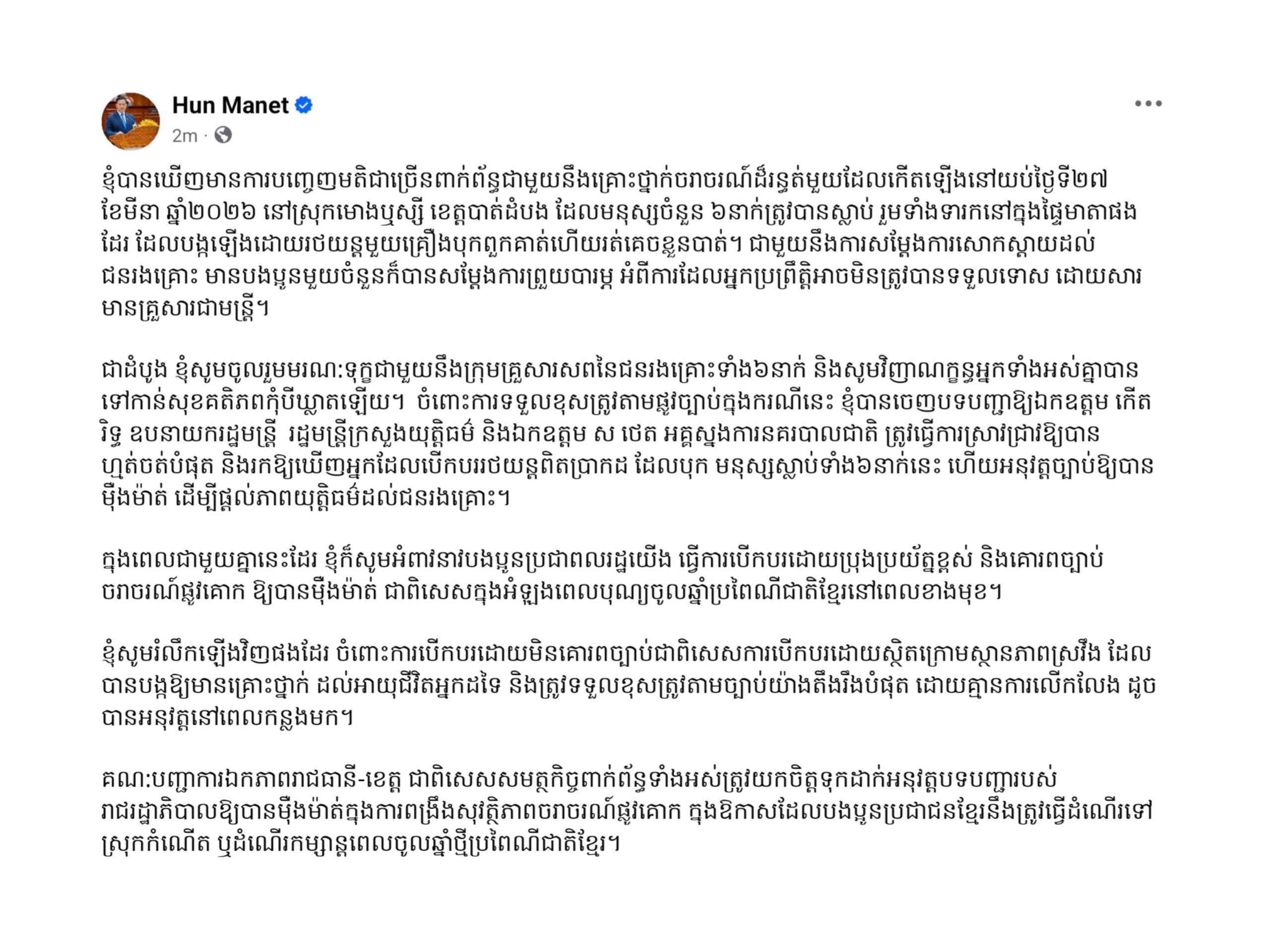 សម្តេចធិបតី ហ៊ុន ម៉ាណែត៖ខ្ញុំបានឃេីញមានការបញ្ចេញមតិជាច្រេីនពាក់ព័ន្ធជាមួយនឹងគ្រោះថ្នាក់ចរាចរណ៍ដ៏រន្ធត់មួយដែលកេីតឡេីងនៅយប់ថ្ងៃទី២៧ ខែមីនា ឆ្នាំ២០២៦ នៅស្រុកមោងឬស្សី ខេត្តបាត់ដំបង ដែលមនុស្សចំនួន ៦នាក់ត្រូវបានស្លាប់ រួមទាំងទារកនៅក្នុងផ្ទៃមាតាផងដែរ ដែលបង្កឡេីងដោយរថយន្តមួយគ្រឿងបុកពួកគាត់ហើយរត់គេចខ្លួនបាត់។ ជាមួយនឹងការសម្តែងការសោកស្តាយដល់ជនរងគ្រោះ មានបងប្អូនមួយចំនួនក៏បានសម្តែងការព្រួយបារម្ភ អំពីការដែលអ្នកប្រព្រឹត្តិអាចមិនត្រូវបានទទួលទោស ដោយសារមានគ្រួសារជាមន្ត្រី។