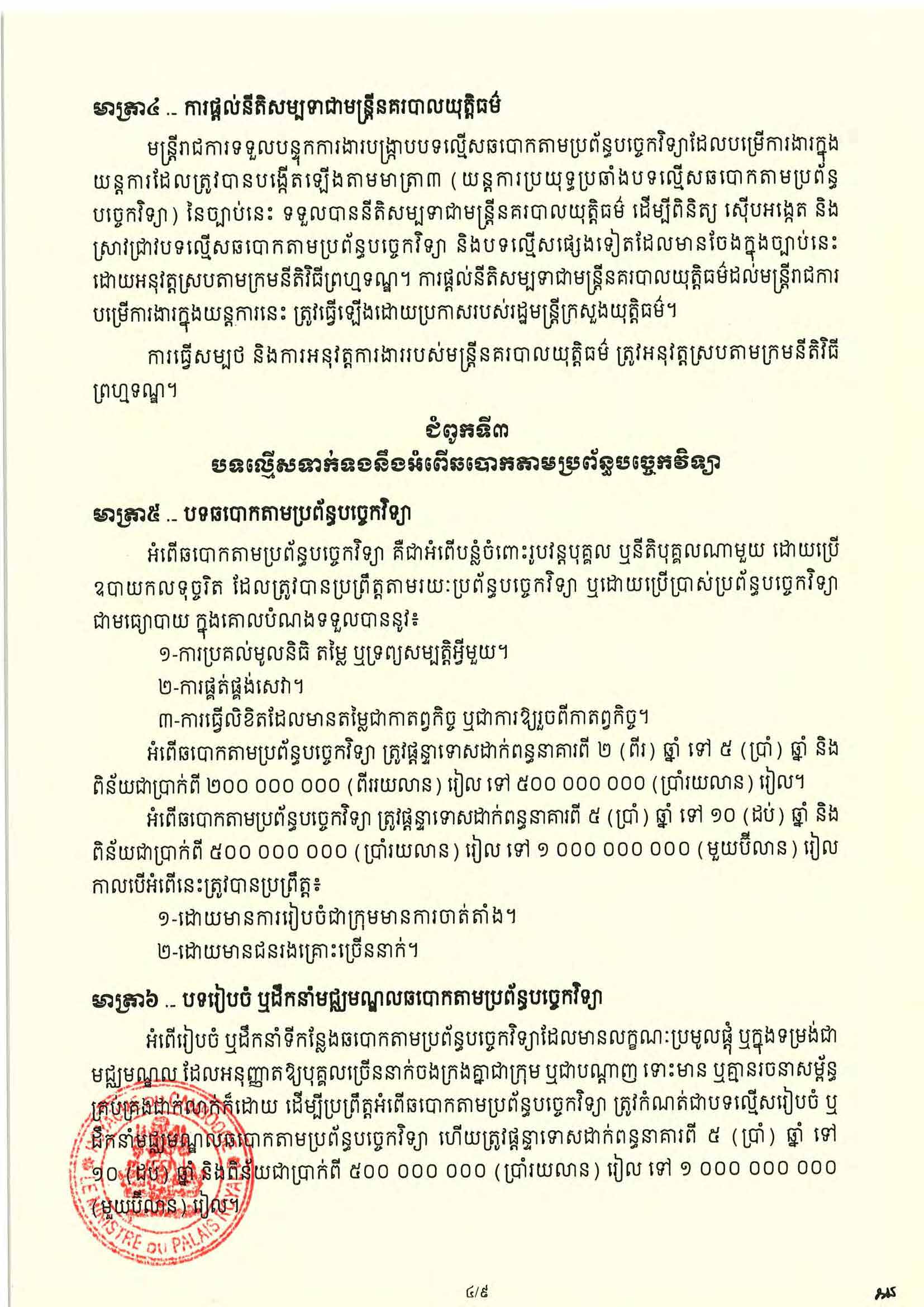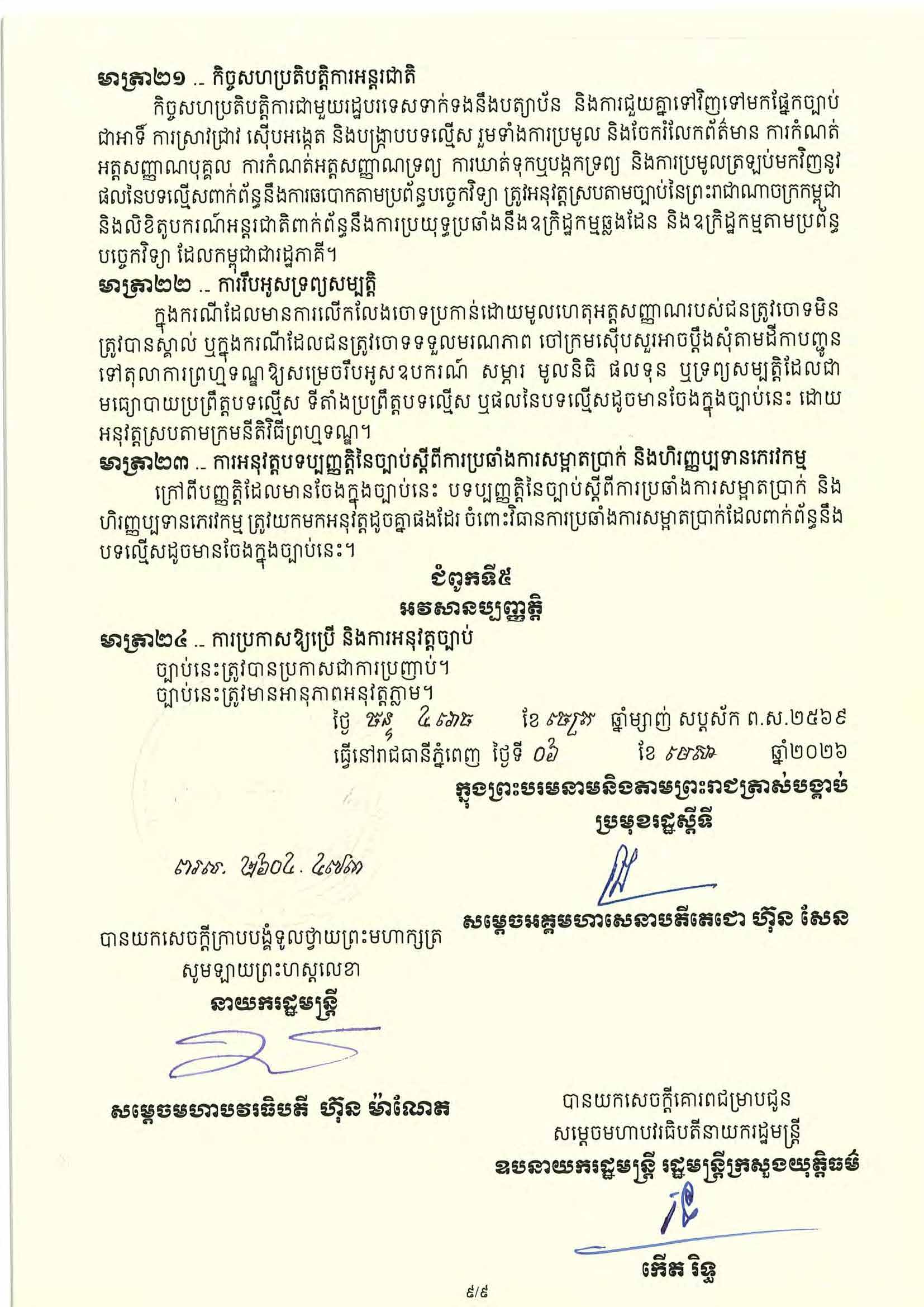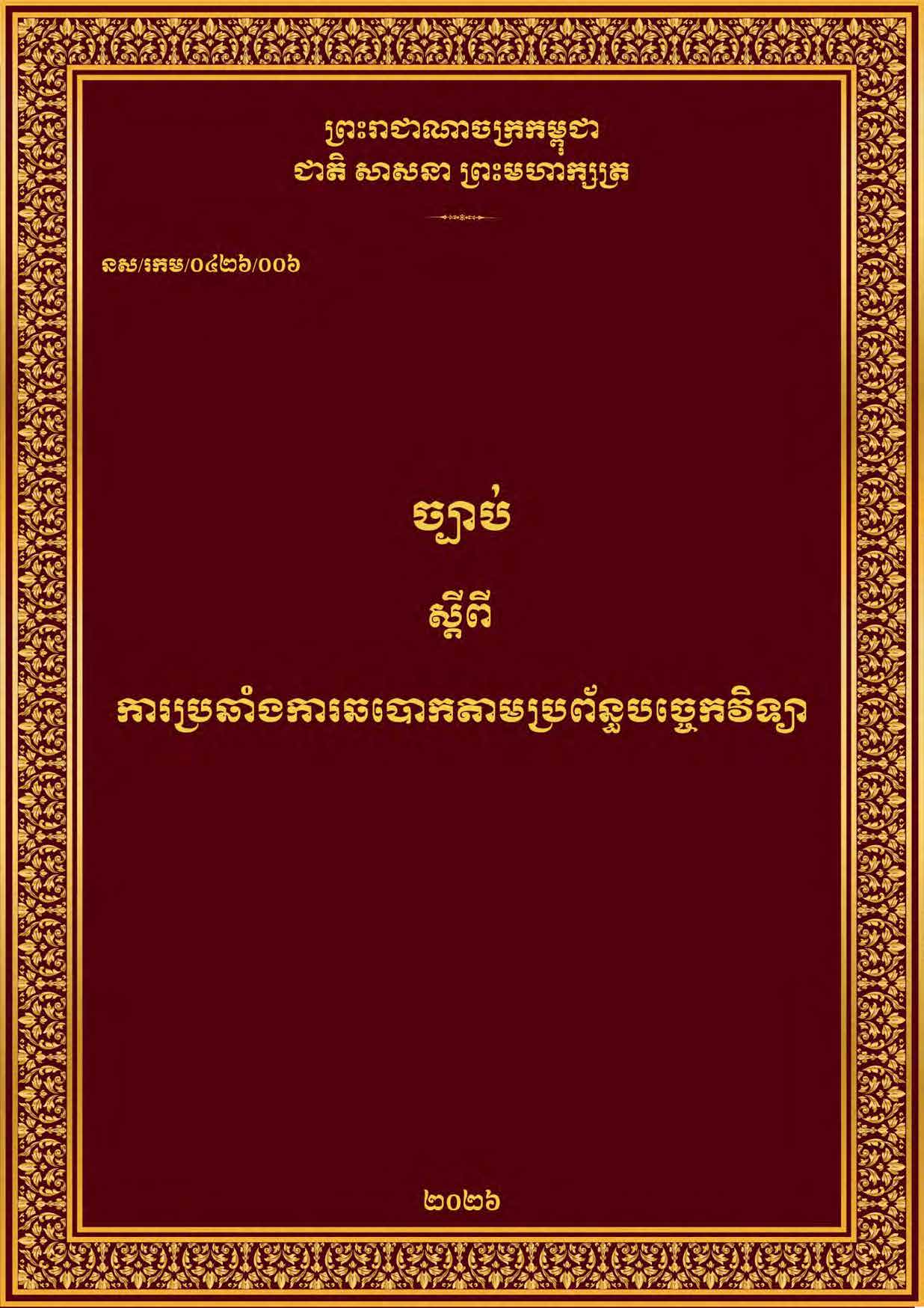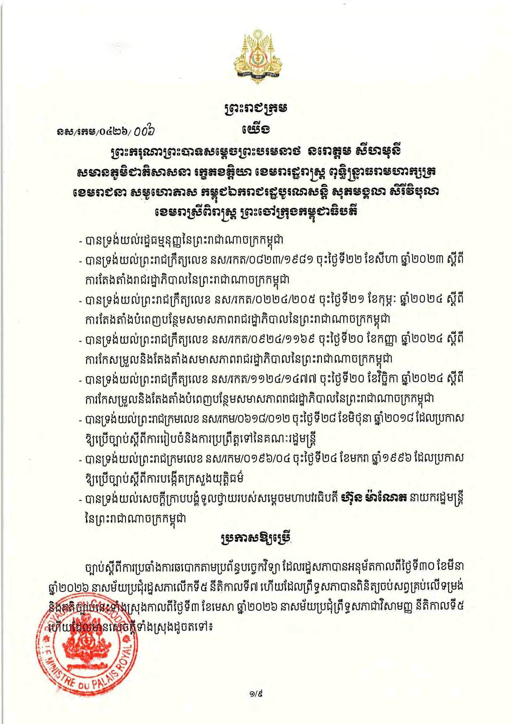 (ភ្នំពេញ)៖ សម្តេចតេជោ ហ៊ុន សែន ប្រមុខរដ្ឋស្តីទី នៅថ្ងៃទី០៦ ខែមេសា ឆ្នាំ២០២៦ បានចេញព្រះរាជក្រម ប្រកាសឱ្យប្រើច្បាប់ស្តីពីការប្រឆាំងការឆបោកតាមប្រព័ន្ធបច្ចេកវិទ្យា ដែលរដ្ឋសភាបានអនុម័តកាលពីថ្ងៃទី៣០ ខែមីនា ឆ្នាំ២០២៦ នាសម័យប្រជុំរដ្ឋសភាលើកទី៥ នីតិកាលទី៧ ហើយដែលព្រឹទ្ធសភាបានពិនិត្យចប់សព្វគ្រប់លើទម្រង់ និងគតិ ច្បាប់នេះទាំងស្រុងកាលពីថ្ងៃទី៣ ខែមេសា ឆ្នាំ២០២៦ នាសម័យប្រជុំព្រឹទ្ធសភាជាវិសាមញ្ញ នីតិកាលទី៥។