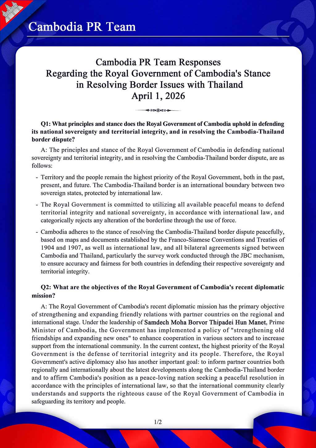 Regarding the Royal Government of Cambodia’s Stance in Resolving Border Issues with Thailand April 1, 2026