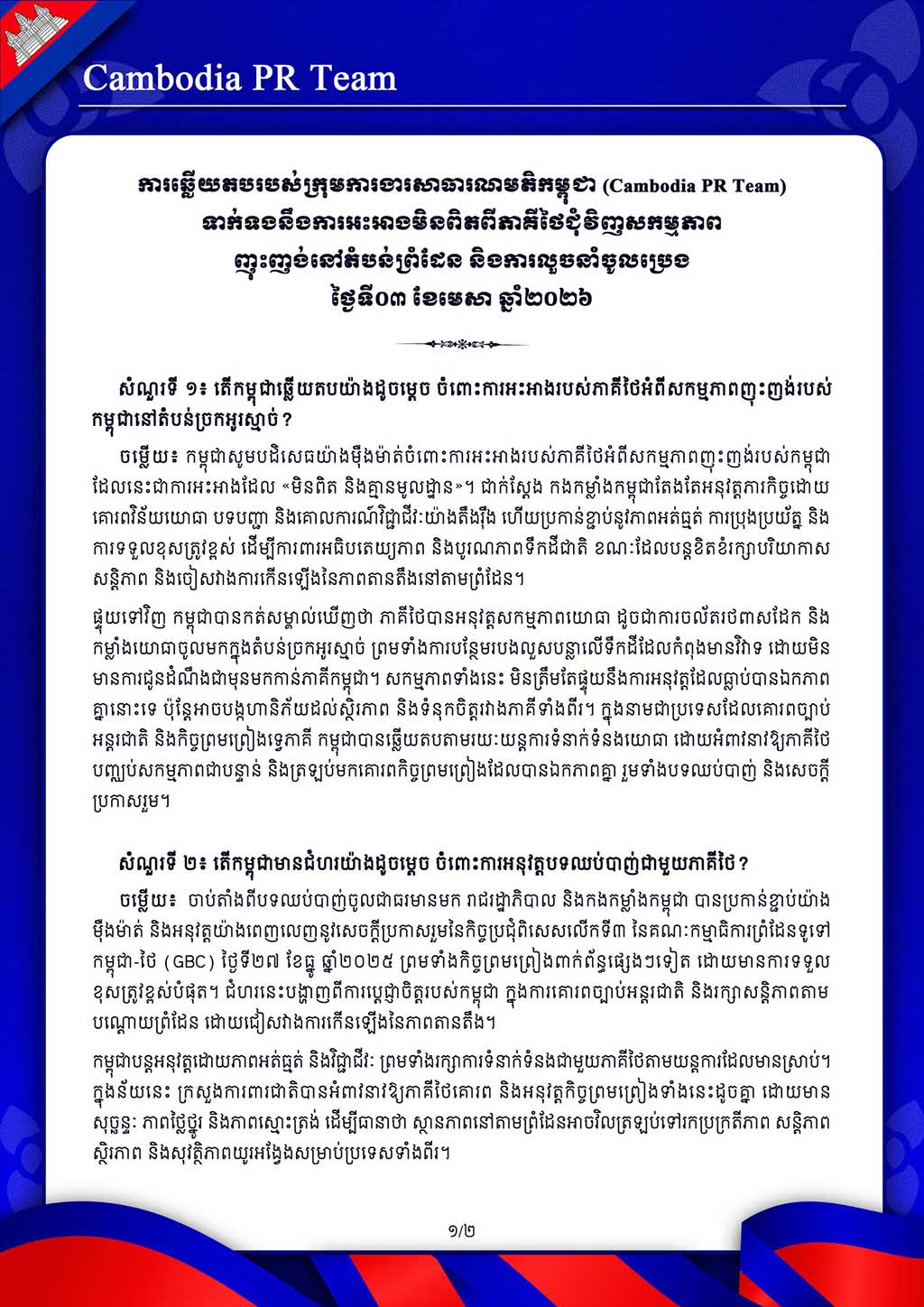 ចម្លើយ៖ ចាប់តាំងពីបទឈប់បាញ់ចូលជាធរមានមក រាជរដ្ឋាភិបាល និងកងកម្លាំងកម្ពុជា បានប្រកាន់ខ្ជាប់យ៉ាងម៉ឺងម៉ាត់ និងអនុវត្តយ៉ាងពេញលេញនូវសេចក្តីប្រកាសរួមនៃកិច្ចប្រជុំពិសេសលើកទី៣ នៃគណៈកម្មាធិការព្រំដែនទូទៅកម្ពុជា-ថៃ (GBC) ថ្ងៃទី២៧ ខែធ្នូ ឆ្នាំ២០២៥ ព្រមទាំងកិច្ចព្រមព្រៀងពាក់ព័ន្ធផ្សេងៗទៀត ដោយមានការទទួលខុសត្រូវខ្ពស់បំផុត។ ជំហរនេះបង្ហាញពីការប្តេជ្ញាចិត្តរបស់កម្ពុជា ក្នុងការគោរពច្បាប់អន្តរជាតិ និងរក្សាសន្តិភាពតាមបណ្តោយព្រំដែន ដោយជៀសវាងការកើនឡើងនៃភាពតានតឹង។