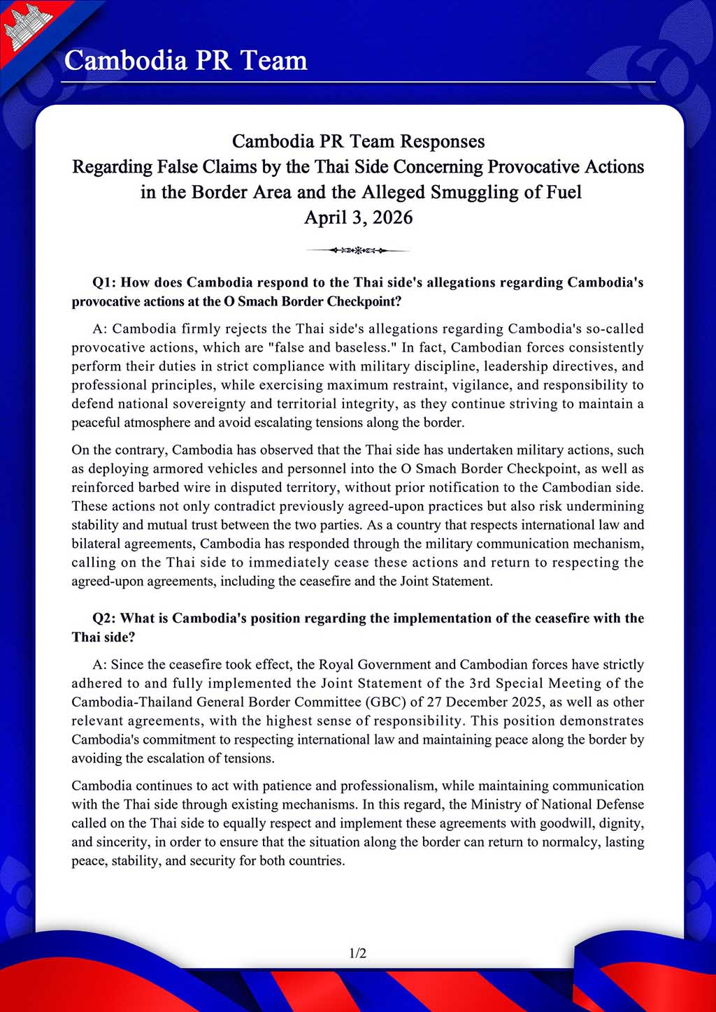 Regarding False Claims by the Thai Side Concerning Provocative Actions in the Border Area and the Alleged Smuggling of Fuel April 3, 2026