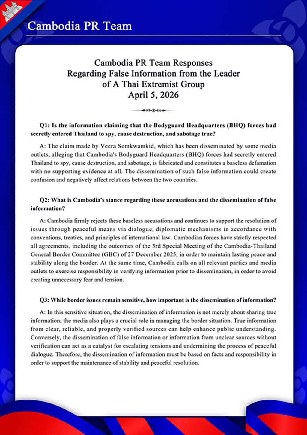 A: Cambodia firmly rejects these baseless accusations and continues to support the resolution of issues through peaceful means via dialogue, diplomatic mechanisms in accordance with conventions, treaties, and principles of international law. Cambodian forces have strictly respected all agreements, including the outcomes of the 3rd Special Meeting of the Cambodia-Thailand General Border Committee (GBC) of 27 December 2025, in order to maintain lasting peace and stability along the border. At the same time, Cambodia calls on all relevant parties and media outlets to exercise responsibility in verifying information prior to dissemination, in order to avoid creating unnecessary fear and tension.