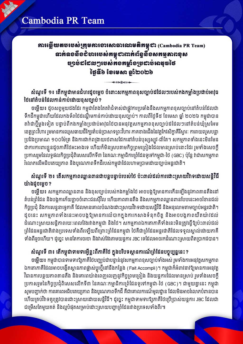 Cambodia PR Team ទាក់ទងនឹងជំហររបស់កម្ពុជាពាក់ព័ន្ធនឹងសកម្មភាពខុស ច្បាប់ដដែលៗរបស់កងកម្លាំងប្រដាប់អាវុធថៃ ថ្ងៃទី៦ ខែមេសា ឆ្នាំ២០២៦