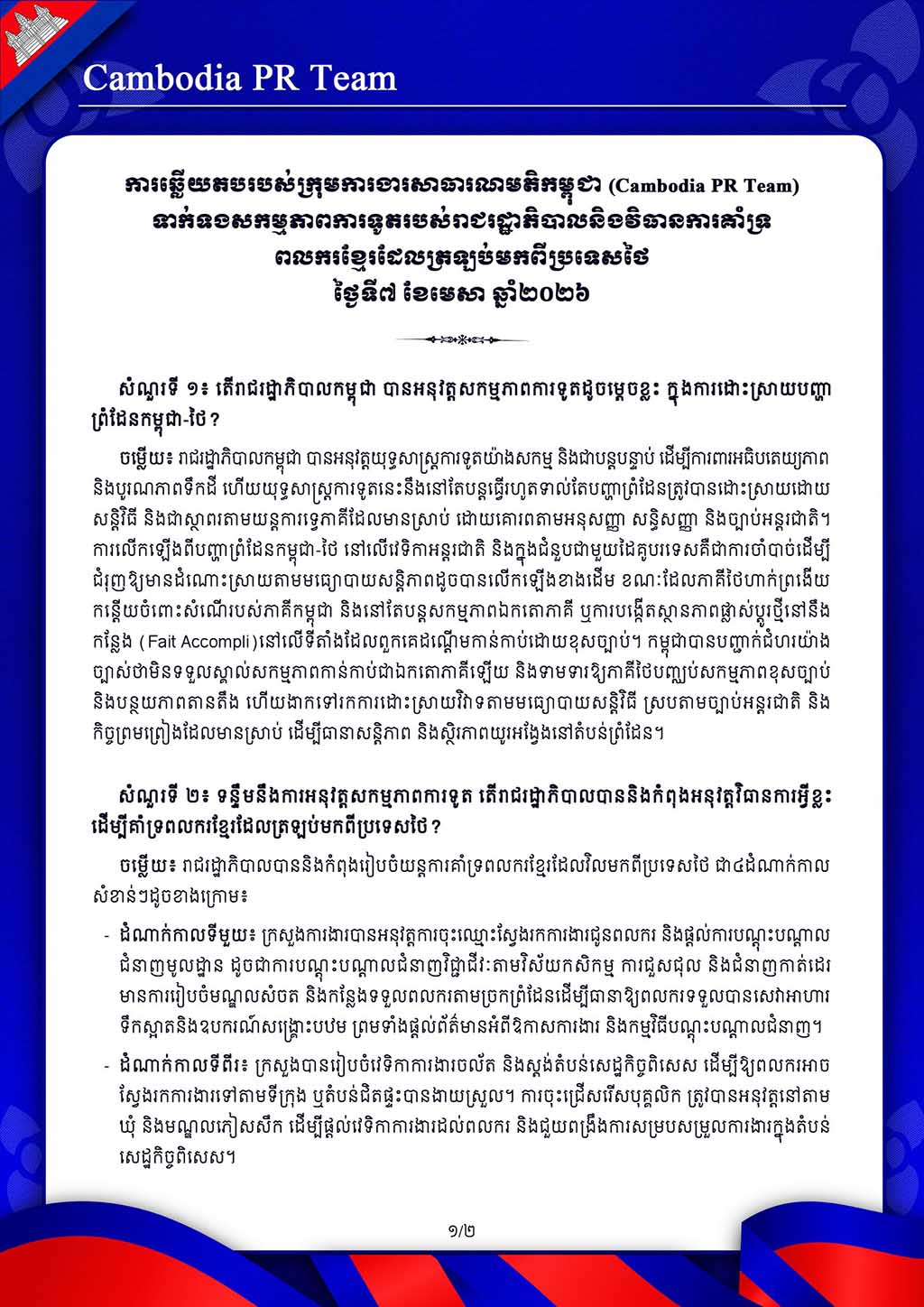 Cambodia PR Team ទាក់ទងសកម្មភាពការទូតរបស់រាជរដ្ឋាភិបាលនិងវិធានការគាំទ្រ ពលករខ្មែរដែលត្រឡប់មកពីប្រទេសថៃ ថ្ងៃទី៧ ខែមេសា ឆ្នាំ២០២៦