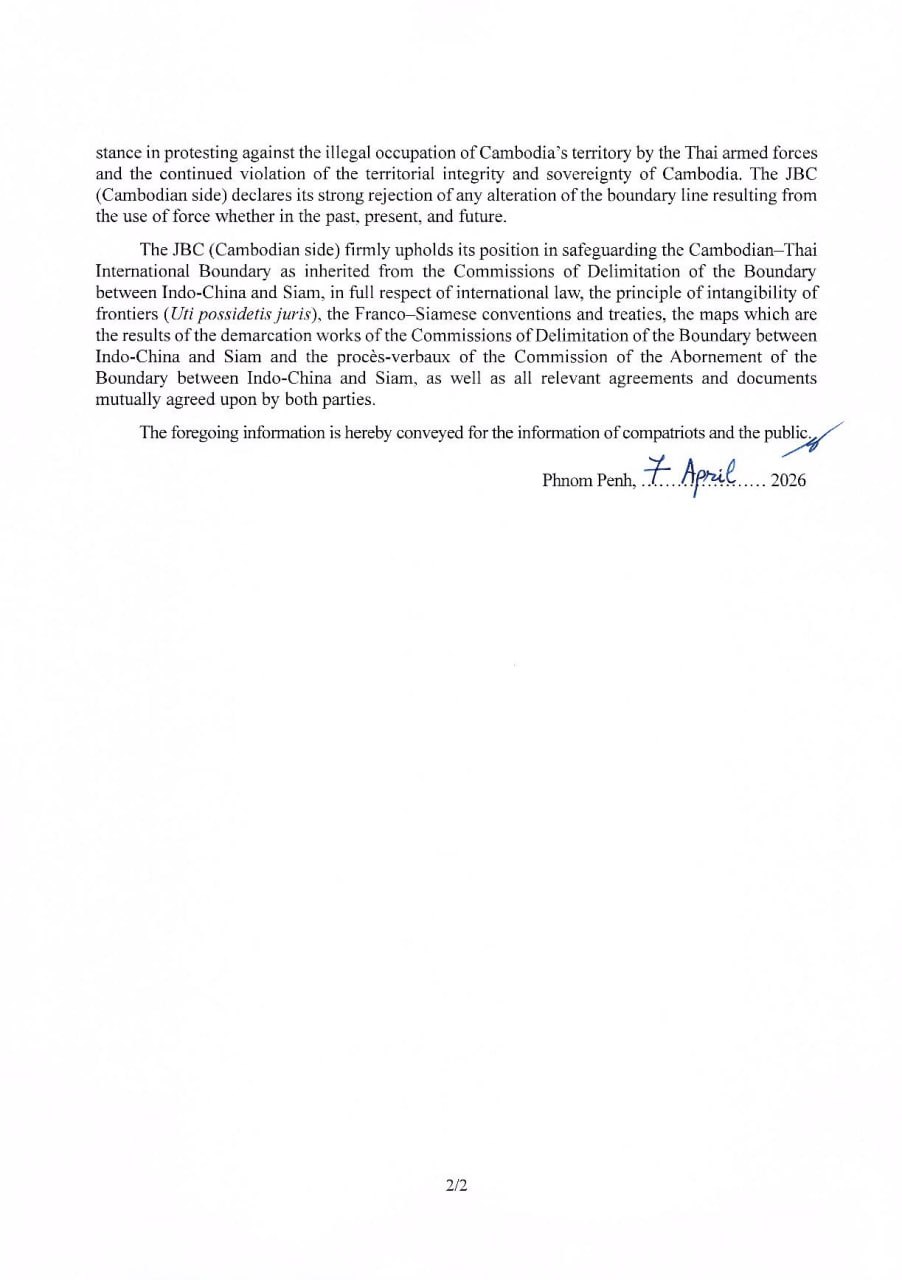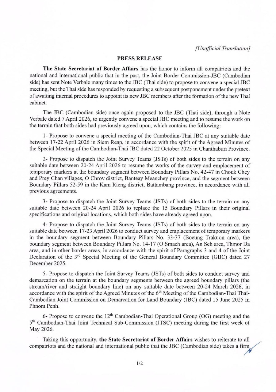 In its latest Note Verbale dated April 7, Cambodia proposed holding a special JBC meeting in Siem Reap between April 17 and 22, 2026, in line with previous agreements reached during a special session in Thailand’s Chanthaburi province in October 2025.