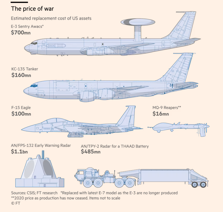 ការវាយតម្លៃនេះអាស្រ័យទៅលើវិធីសាស្ត្រ និងប្រភេទបរិក្ខារយោធាផ្សេងៗគ្នាដែលរងការខូចខាត ឬត្រូវបានបំផ្លាញ។ «ការខាតបង់តិច ឬច្រើនគឺអាស្រ័យលើប្រភេទបរិក្ខារយោធានៅតាមមូលដ្ឋានទ័ព អាមេរិកដែលត្រូវបានវាយប្រហារ»។ នេះជាការគូសបញ្ជាក់របស់លោក Cancian។ លោកបន្តថាការប្ដូរយន្ដហោះ E-3 Sentry ថ្មី អាចនឹងត្រូវចំណាយច្រើនជាង ៧០០លានដុល្លារ។ យន្ដហោះ E-3 ត្រូវបានចាត់ទុកថាជាទីបញ្ជាការនៅលើអាកាសបានរងការខូចខាតយ៉ាងដំណំក្នុងការវាយប្រហារមួយលើមូលដ្ឋានទ័ពអាកាស Prince Sultan ស្ថិតនៅក្បែរទីក្រុងរីយ៉ាដ។