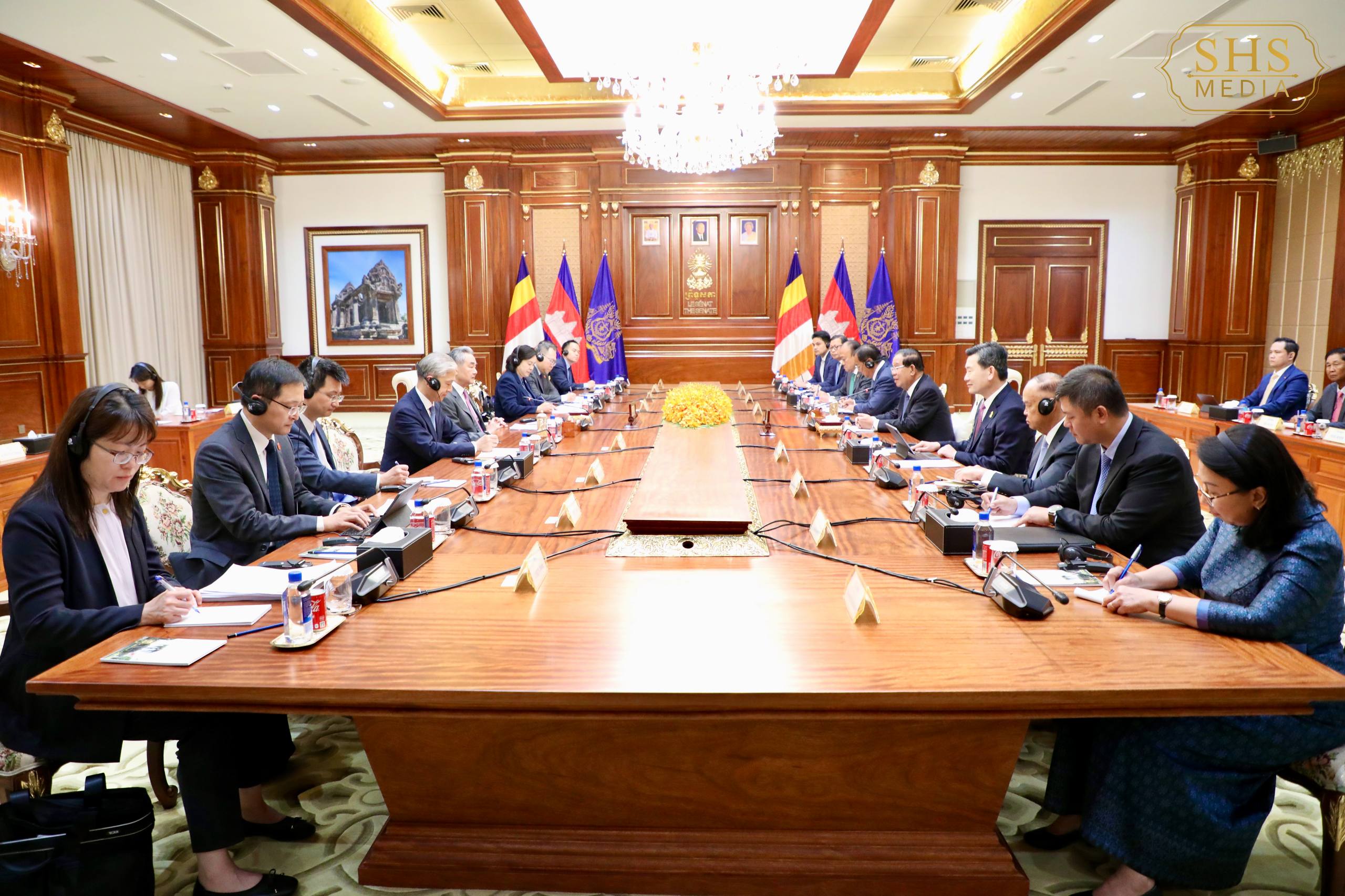 នៅវិមានសាមគ្គីភាព នៃព្រឹទ្ធសភា នាព្រឹកថ្ងៃពុធ ៧កើត ខែពិសាខ ឆ្នាំមមី អដ្ឋស័ក ព.ស.២៥៦៩ ត្រូវនឹងថ្ងៃទី២៣ ខែមេសា ឆ្នាំ២០២៦ សម្តេចអគ្គមហាសេនាបតីតេជោ ហ៊ុន សែន ប្រមុខរដ្ឋស្តីទីនៃព្រះរាជាណាចក្រកម្ពុជា បានអនុញ្ញាតឱ្យ ឯកឧត្តម វ៉ាង យី (Wang Yi) រដ្ឋមន្ត្រីការបរទេស នៃសាធារណរដ្ឋប្រជាមានិតចិន និងគណៈប្រតិភូ ចូលជួបសម្ដែងការគួរសម និងពិភាក្សាការងារ ក្នុងឱកាសដែលឯកឧត្តមអញ្ជើញចូលរួមក្នុងកិច្ចប្រជុំសន្ទនាយុទ្ធសាស្ត្រ ២បូក២ រដ្ឋមន្ត្រីការបរទេស រដ្ឋមន្ត្រីការពារជាតិ កម្ពុជា-ចិន ដែលធ្វើឡើងនៅក្នុងប្រទេសកម្ពុជា។
