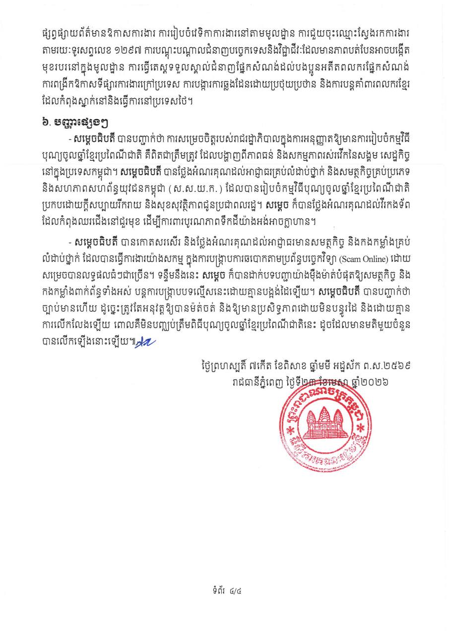 សេចក្តីប្រកាសព័ត៌មាន ស្តីពី លទ្ធផលកិច្ច​ប្រជុំពេញ​អង្គ​គណៈ​រដ្ឋ​មន្រ្តី ក្រោមអធីបតីភាពដ៏ខ្ពង់ខ្ពស់របស់សម្តេចមហាបវរធិបតី ហ៊ុន ម៉ាណែត នាយករដ្ឋមន្ត្រី នៃព្រះរាជាណាចក្រកម្ពុជា ថ្ងៃទី២៣ ខែមេសា ឆ្នាំ២០២៦។