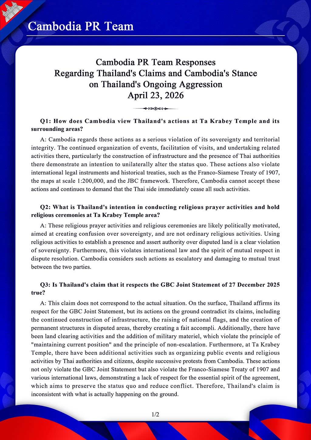 Regarding Thailand’s Claims and Cambodia’s Stance on Thailand’s Ongoing Aggression April 23, 2026 Regarding Thailand’s Claims and Cambodia’s Stance on Thailand’s Ongoing Aggression April 23, 2026