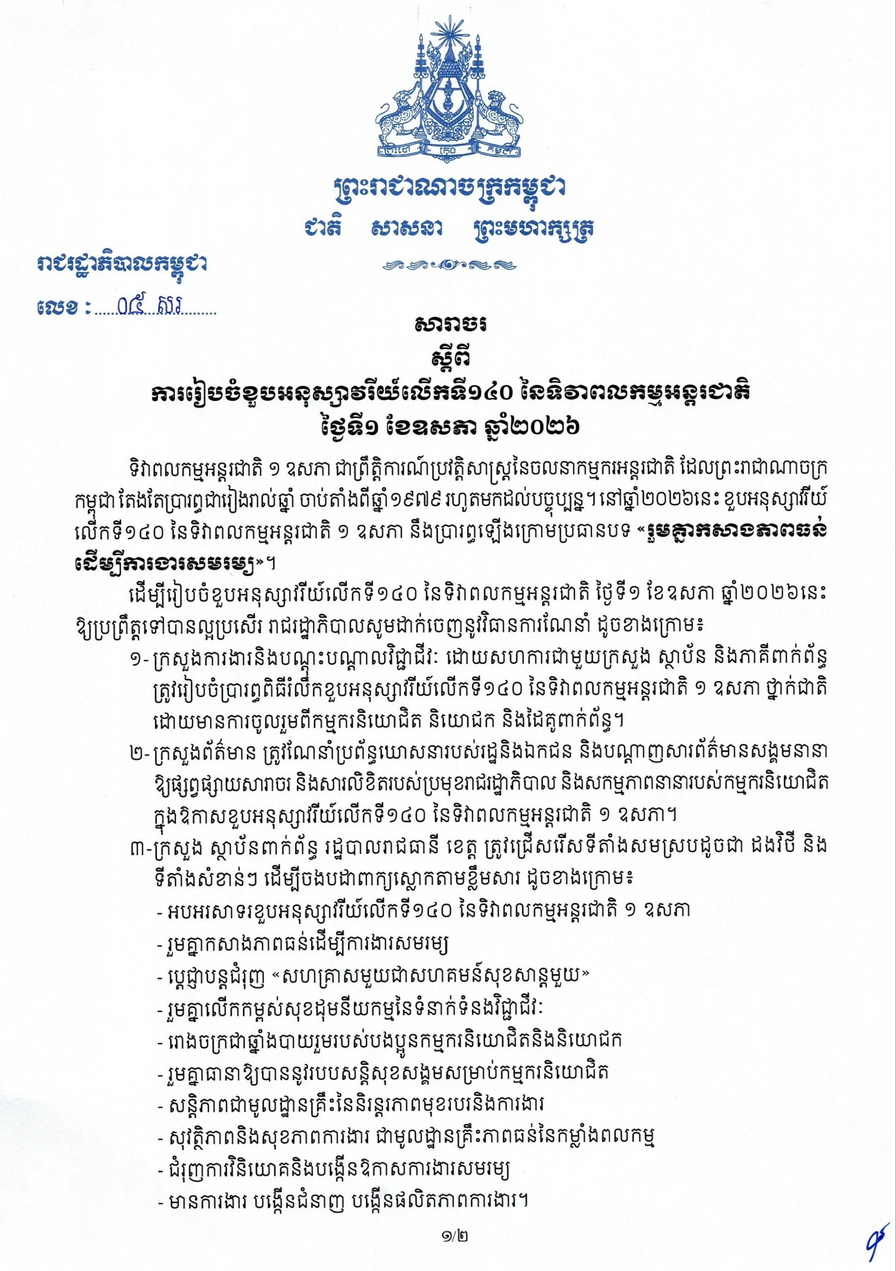 ដើម្បីរៀបចំខួបអនុស្សាវរីយ៍លើកទី១៤០ នៃទិវាពលកម្មអន្តរជាតិ ថ្ងៃទី១ ខែឧសភា ឆ្នាំ២០២៦នេះ ឱ្យប្រព្រឹត្តទៅបានល្អប្រសើរ រាជរដ្ឋាភិបាល បានដាក់ចេញនូវវិធានការណែនាំ ដូចខាងក្រោម៖