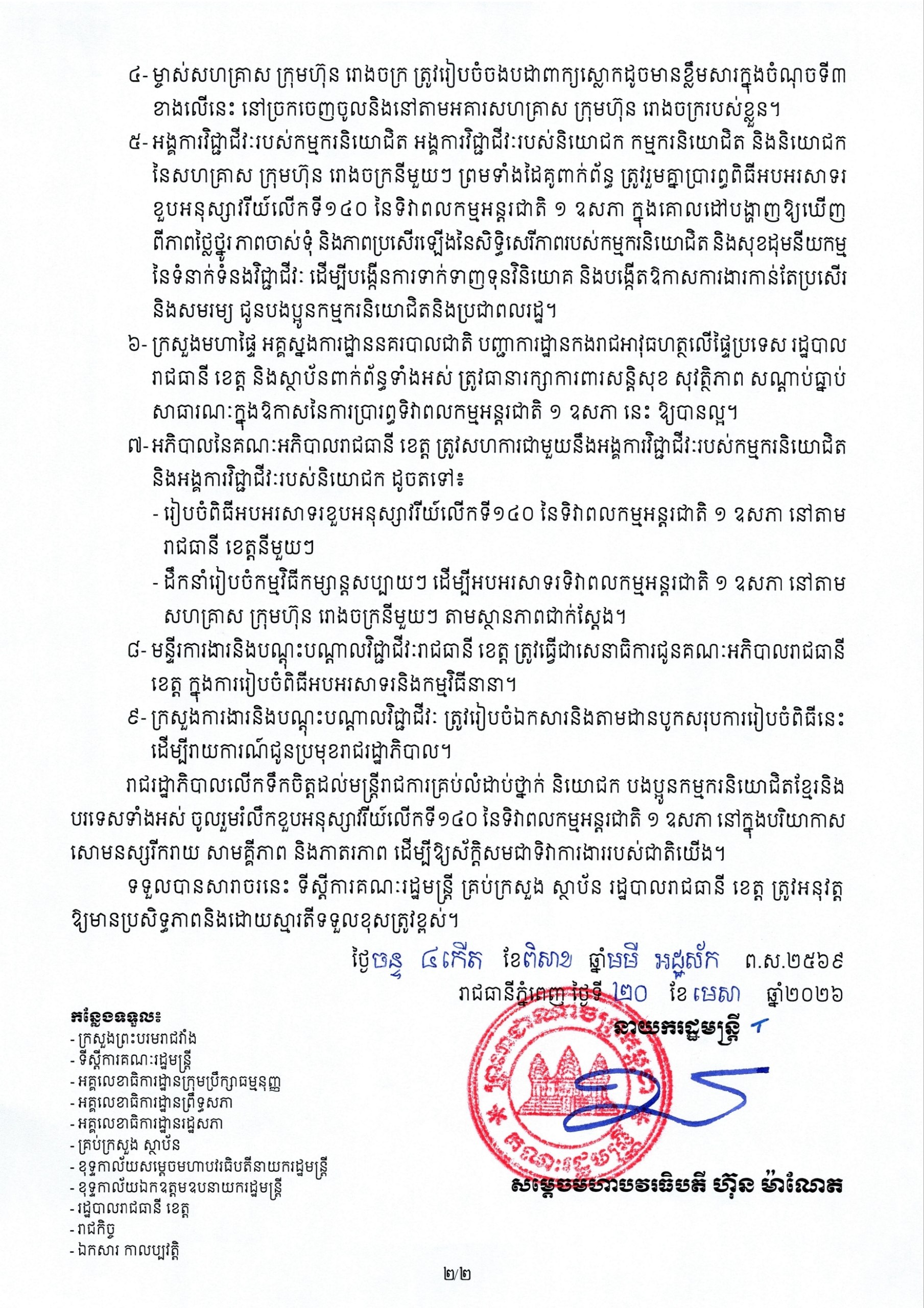 សម្តេចបវរធិបតី ហ៊ុន ម៉ាណែត ចេញសារាចរណែនាំ ស្តីពីការរៀបចំខួបអនុស្សាវរីយ៍លើកទី១៤០ នៃទិវាពលកម្មអន្តរជាតិ ថ្ងៃទី១ ខែឧសភា ឆ្នាំ២០២៦