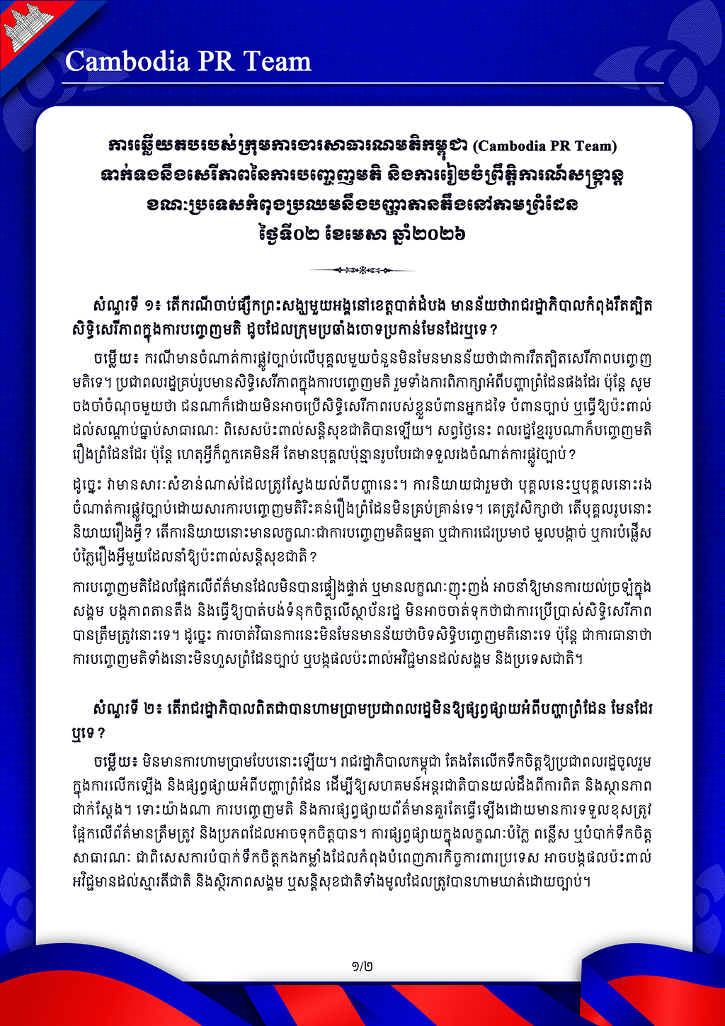 ការឆ្លើយតបរបស់ក្រុមការងារសាធារណមតិកម្ពុជា (Cambodia PR Team) ទាក់ទងសកម្មភាពការទូតរបស់រាជរដ្ឋាភិបាលនិងវិធានការគាំទ្រ ពលករខ្មែរដែលត្រឡប់មកពីប្រទេសថៃ ថ្ងៃទី៧ ខែមេសា ឆ្នាំ២០២៦ សំណួរទី