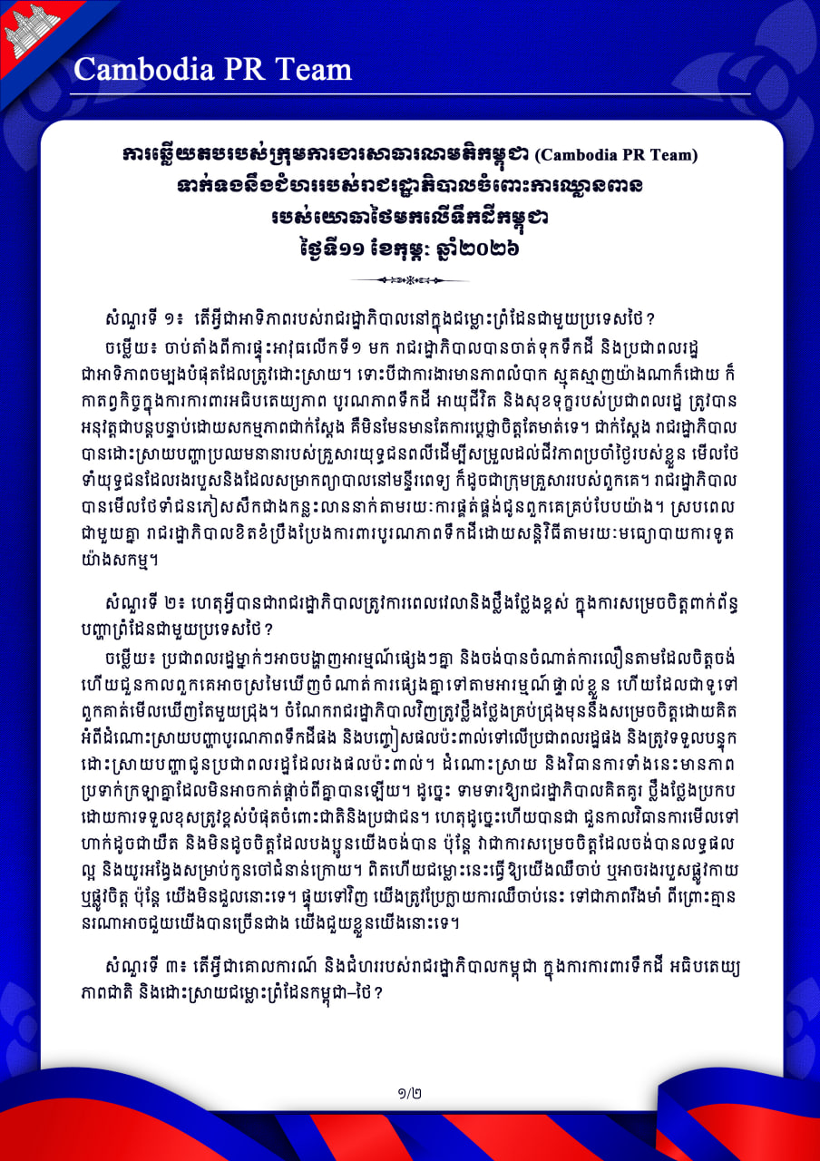 ការឆ្លើយតបរបស់ក្រុមការងារសាធារណមតិកម្ពុជា (Cambodia PR Team) ទាក់ទងនឹងជំហររបស់រាជរដ្ឋាភិបាលចំពោះការឈ្លានពាន របស់យោធាថៃមកលើទឹកដីកម្ពុជា ថ្ងៃទី១២ ខែកុម្ភៈ ឆ្នាំ២០២៦ ប្រកាសព័ត៌មានព័ត៌មានជាតិស្រាវជ្រាវថ្ងៃព្រហស្បតិ៍ ទី១២ ខែកុម្ភៈ ឆ្នាំ២០២៦ 1009